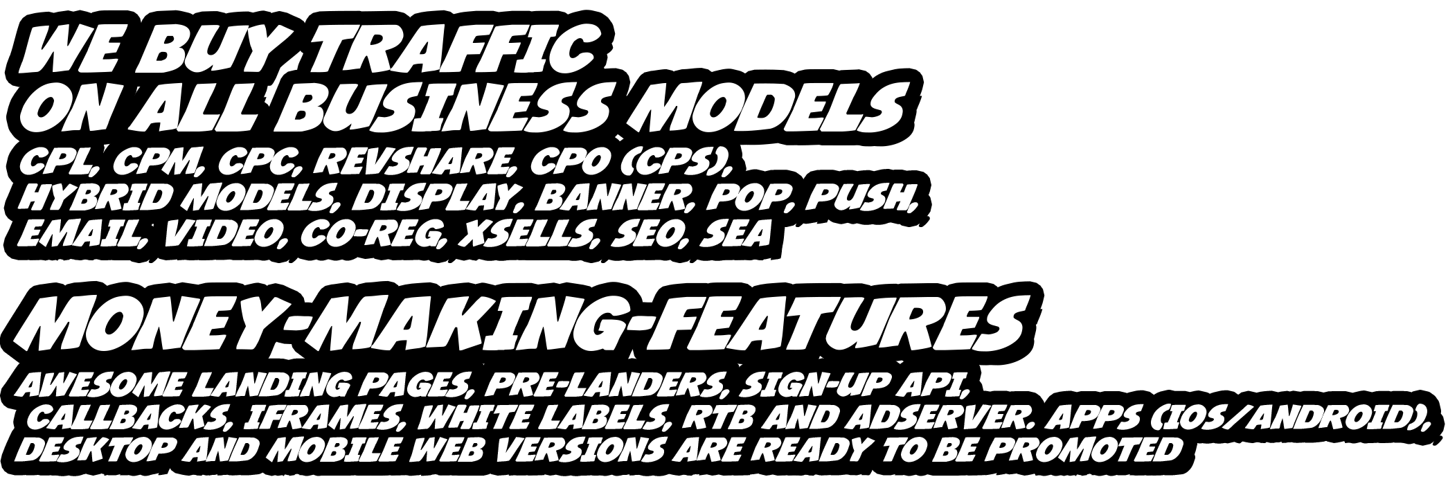 Our business models cover CPL, RevShare, PPS, CPM or CPC and more, thus allowing promoting our products via affiliate, display, push or email marketing and more.